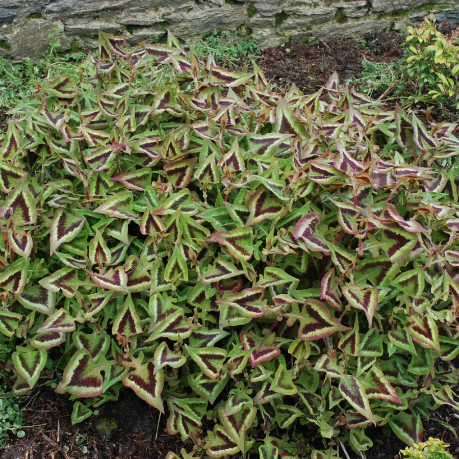 Саженцы горца мелкоголового Пёпл Фэнтэзи (Persicaria micrantha Purple Fantasy), благодаря яркой раскраске листьев, могут выполнять функцию акцента в цветочной композиции. Яркие зеленые листья по центру украшены пурпурно-сливовым треугольником, обрамленным нежно-зеленым кантом. Листочек кажется бархатным из-за множества ворсинок бордового цвета. Цветет растение с середины лета, но цветы особо не отражаются на его декоративных качествах – меленькие розово-белые цветы теряются на фоне яркой листвы. В высоту растение достигает 50-60 сантиметров. Наиболее яркой окраски горец достигает при посадке на солнечных участках, возможна легкая полутень.