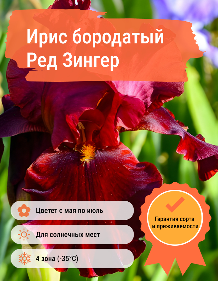 Семена ириса бородатого Ред Зингер вырастают до одного метра в высоту, при этом размер самого цветка будет составлять 15 см. Соцветия издают приятный тонкий аромат. Темно-красный оттенок будет выгодно выделятся на фоне других растений в вашем саду. Растение имеет хорошую устойчивость к низким температурам, поэтому ему не страшны весенние и зимние заморозки. К почве неприхотлив, но отдает предпочтение плодородным видам земли. В засушливую погоду нужно дополнительно поливать побеги и корневую систему. Растение нуждается в особом внимание первое время после посадки. Хорошо разнообразит композицию сада.
