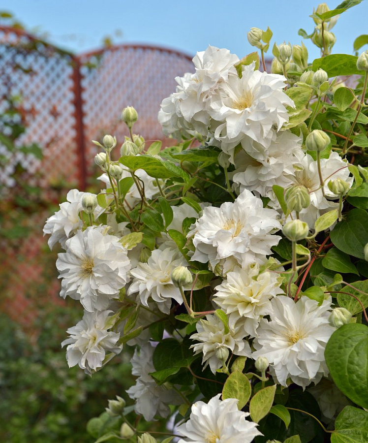 Листья клематиса имеют зеленую окраску и интересную форму, что добавляет растению изысканности. Оно предпочитает солнечные и полутенистые места для посадки, а также плодородные почвы. Растение требует умеренного полива и регулярного удобрения для обильного цветения.