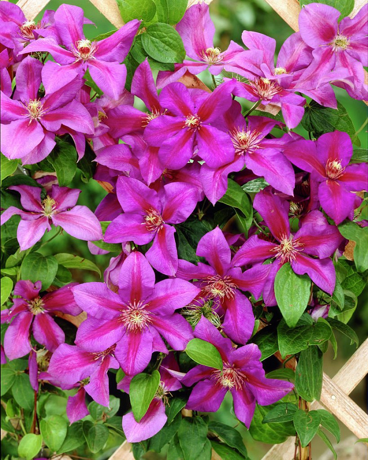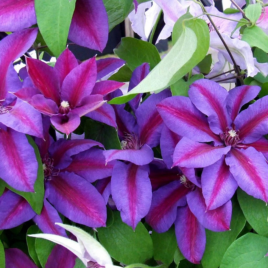 Саженцы клематиса крупноцветкового Миссис Н. Томпсон относятся к сортам знаменитой английской селекции, которые отличаются своим классическим внешним видом и обильным цветением. Подходит для выращивания в контейнере. На прошлогодних побегах образуются крупные цветки с диаметром до 15 сантиметров простой формы, но яркой двухцветной окраской. Основным оттенком выступает фиолетовый, а посередине каждого лепестка проходит полоса малинового цвета. В течение одного сезона зацветает дважды: сначала в конце весны, повторно ― в конце лета. Предпочитает посадку на солнечном месте с рыхлой нейтральной почвой.