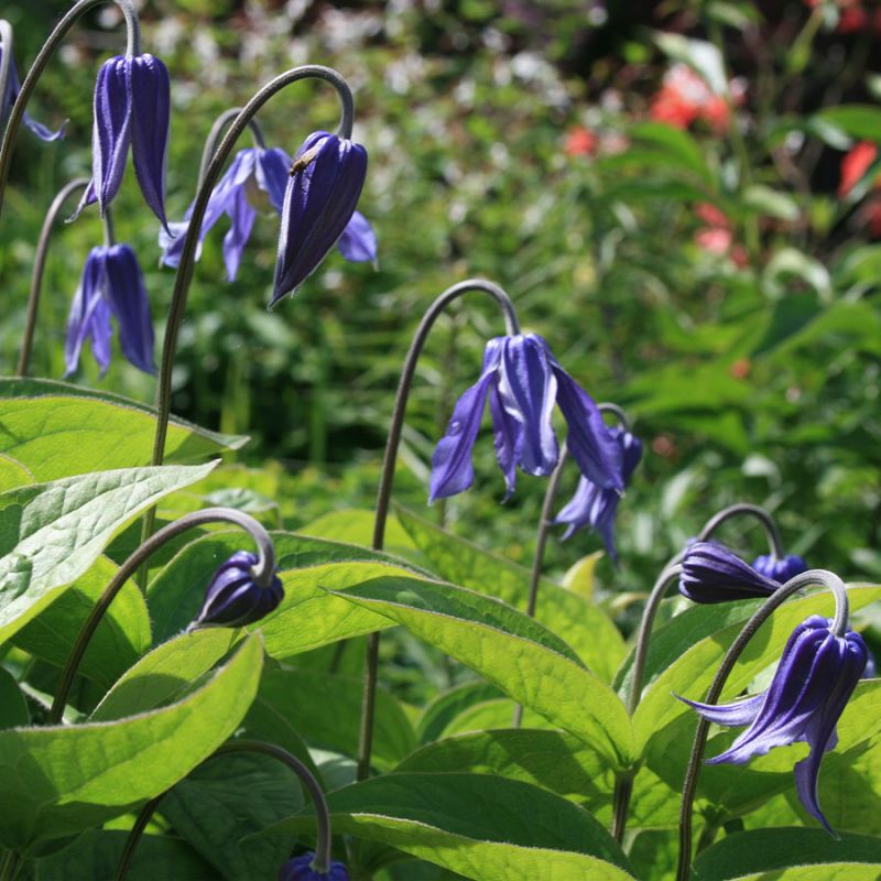 Саженцы клематиса цельнолистного (Clematis integrifolia) имеют своеобразный внешний вид. Высота растения составляет 60-100 см, листья овальные с матовой структурой не рассеченные. Цветки одиночные, поникшие колокольчики синего окраса. Клематис цельнолистный (Clematis integrifolia) не требователен к месту посадки, но на открытых солнечных участках с плодородной почвой цветет обильнее. Цветение длится на протяжении трех недель, начиная со второй декады июня. Подходит для одиночных и групповых посадок, на газоне, каменистых горках и полянах.