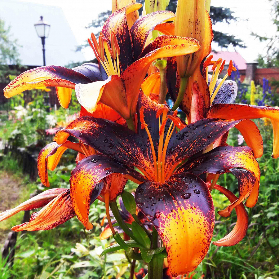 Луковицы Лилии азиатской Танго Париж Харт (Lilium asiatic Paris Heart) удивляют тигровой окраской раскрывающихся цветков. Темно-фиолетовый цвет в центре цветка контрастирует с ярко-оранжевыми кончиками лепестков. Оттенки плавно переходят из одного в другой, благодаря рассеянному темному крапу. На одном цветоносе вы не найдете ни одного одинакового цветка, природа будто раскрашивает каждый из них по отдельности. Цветение продолжительное, начинается во второй половине июня. Сорт пригоден для выгонки вне сезона.
