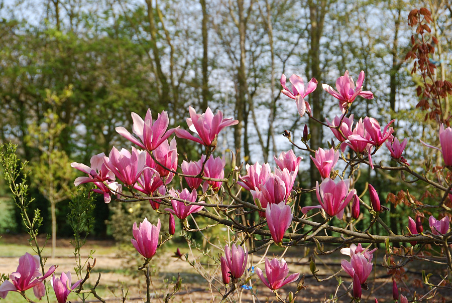 Саженцы Магнолии Спектрум (Spectrum) – растение необычайной красоты. В сезон на раскидистой кроне появляются очень большие цветы. Они источают приятный аромат и радуют глаз своим розовым цветом. Декоративная магнолия имеет коловидную крону, диаметр которой может доходить до трёх метров. Высота варьируется от 5 до 7 метров. Цветы правильной формы по-настоящему большие, 25 сантиметров в диаметре. Оттенок бутонов варьируется от розового до красного. После цветения на ветках образуется плоды, они не съедобные, но выглядят красиво. По форме напоминают шишку. Магнолия украсит сад и привнесёт экзотики.
