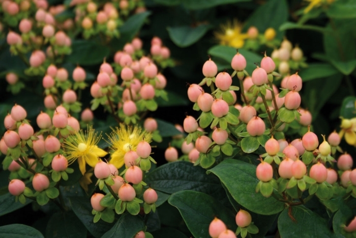 Саженцы Зверобоя непахучего Мэджикал Бьюти (MAGICAL BEAUTY 'Kolmbeau') являются многолетним кустарником, который привлекает своей декоративностью. Это довольно плотный, разветвленный куст высотой и диаметром до 90 сантиметров. Растение считается полувечнозеленым, так как древесные побеги есть только в нижней части. Листва пышная, темно-зеленого оттенка. Зверобою непахучему Мэджикал Бьюти почва требуется дренированная, а место лучше выбирать солнечное. Цветение начинается в июне. Появляются небольшие цветки желтого цвета с тычинками. К июлю созревают плоды приятного лососево-розового оттенка. Однако к октябрю плоды начинают чернеть. Зимой побеги стоит прикрывать в несколько слоев нетканым материалом.